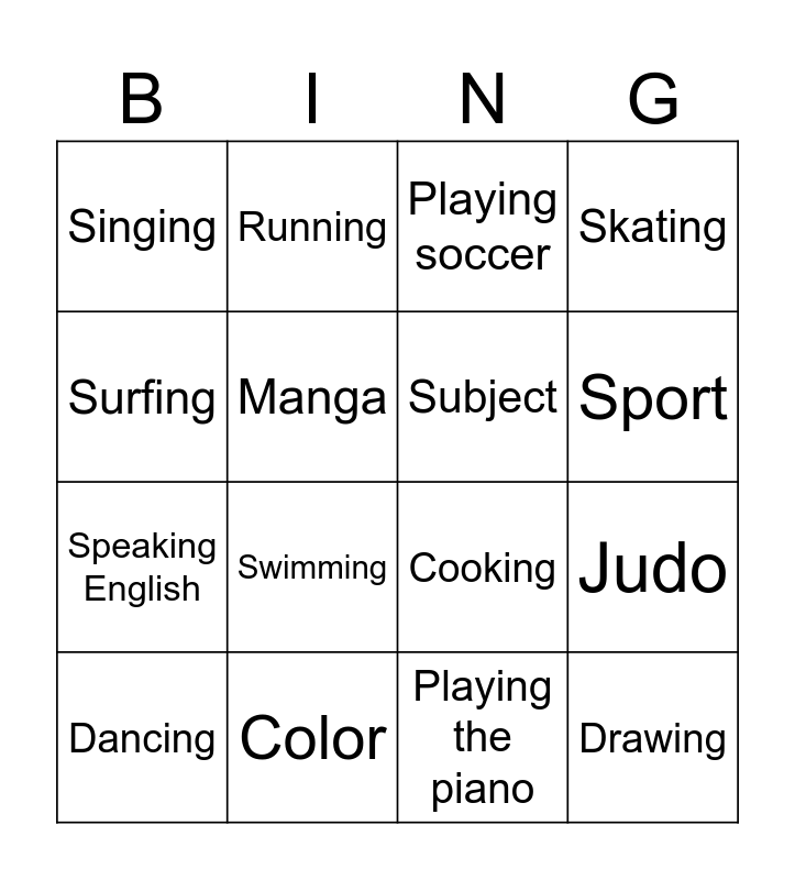This bingo card has 18 words: Swimming, Drawing, Playing soccer, Singing, Cooking, Skating, Dancing, Running, Sport, Speaking English, Playing the piano, Surfing, Judo, Manga, Subject, Animal, Color and Food.
