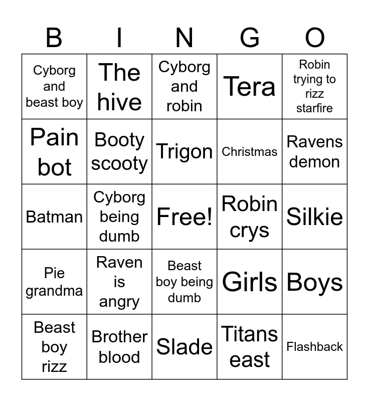 This bingo card has a free space and 24 words: Beast boy rizz, Raven is angry, Trigon, Titans east, Robin trying to rizz starfire, Cyborg and beast boy, The hive, Cyborg and robin, Robin crys, Silkie, Batman, Booty scooty, Girls, Boys, Pain bot, Brother blood, Slade, Tera, Ravens demon, Pie grandma, Cyborg being dumb, Beast boy being dumb, Christmas and Flashback.