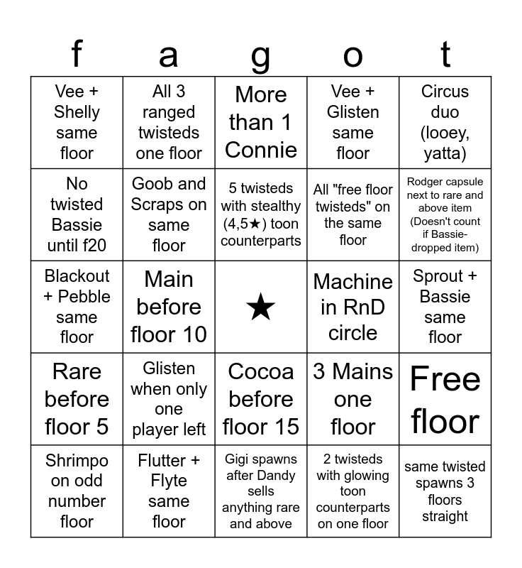 This bingo card has a free space and 24 words: Glisten when only one player left, Flutter + Flyte same floor, 5 twisteds with stealthy (4,5★) toon counterparts, Shrimpo on odd number floor, Circus duo (looey, yatta), Vee + Shelly same floor, No twisted Bassie until f20, All 3 ranged twisteds one floor, Machine in RnD circle, Cocoa before floor 15, All "free floor twisteds" on the same floor, Blackout + Pebble same floor, 3 Mains one floor, Free floor, Goob and Scraps on same floor, 2 twisteds with glowing toon counterparts on one floor, Sprout + Bassie same floor, More than 1 Connie, Rodger capsule next to rare and above item (Doesn't count if Bassie-dropped item), Main before floor 10, same twisted spawns 3 floors straight, Rare before floor 5, Vee + Glisten same floor and Gigi spawns after Dandy sells anything rare and above.