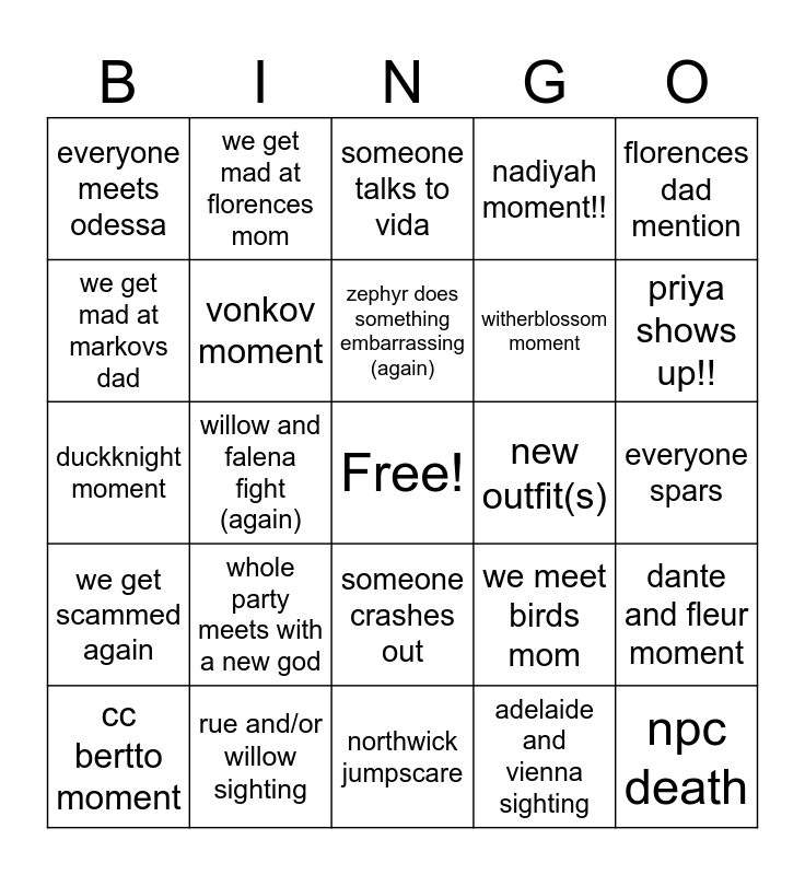 This bingo card has a free space and 32 words: crimson dies, rue and/or willow sighting, northwick jumpscare, fleur dies (again), priya shows up!!, everyone meets odessa, willow and falena fight (again), someone crashes out, nadiyah moment!!, npc death, we get mad at markovs dad, we get mad at florences mom, adelaide and vienna sighting, we meet one of our new character, we get scammed again, near death experience, argument, new outfit(s), everyone spars, cc bertto moment, whole party meets with a new god, turnip moment, we meet birds mom, dante and fleur moment, duckknight moment, vonkov moment, someone talks to vida, witherblossom moment, florences dad mention, ODante moment, heron pulls out the star jar and zephyr does something embarrassing (again).