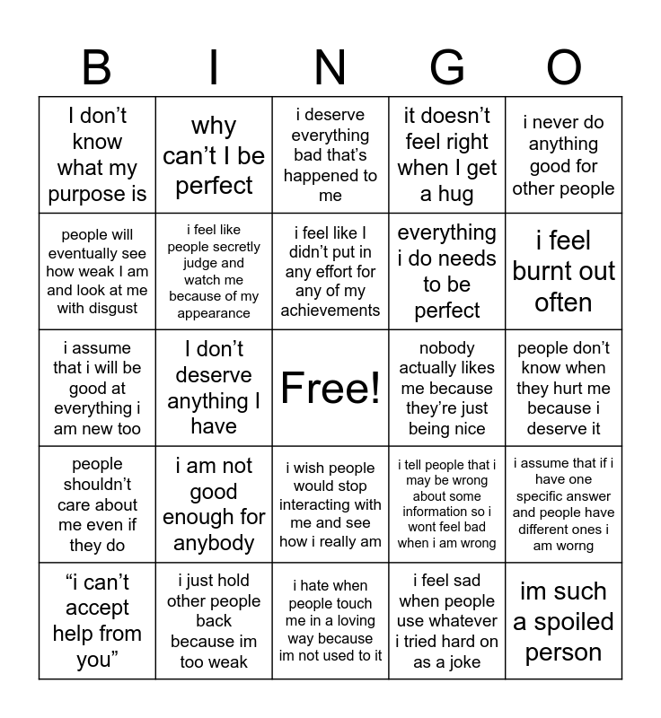 This bingo card has a free space and 24 words: i am not good enough for anybody, i just hold other people back because im too weak, i feel like I didn’t put in any effort for any of my achievements, “i can’t accept help from you”, i never do anything good for other people, I don’t know what my purpose is, people will eventually see how weak I am and look at me with disgust, why can’t I be perfect, nobody actually likes me because they’re just being nice, i wish people would stop interacting with me and see how i really am, everything i do needs to be perfect, i assume that i will be good at everything i am new too, i tell people that i may be wrong about some information so i wont feel bad when i am wrong, i assume that if i have one specific answer and people have different ones i am worng, i feel like people secretly judge and watch me because of my appearance, i feel sad when people use whatever i tried hard on as a joke, people don’t know when they hurt me because i deserve it, i deserve everything bad that’s happened to me, i feel burnt out often, I don’t deserve anything I have, im such a spoiled person, people shouldn’t care about me even if they do, it doesn’t feel right when I get a hug and i hate when people touch me in a loving way because im not used to it.