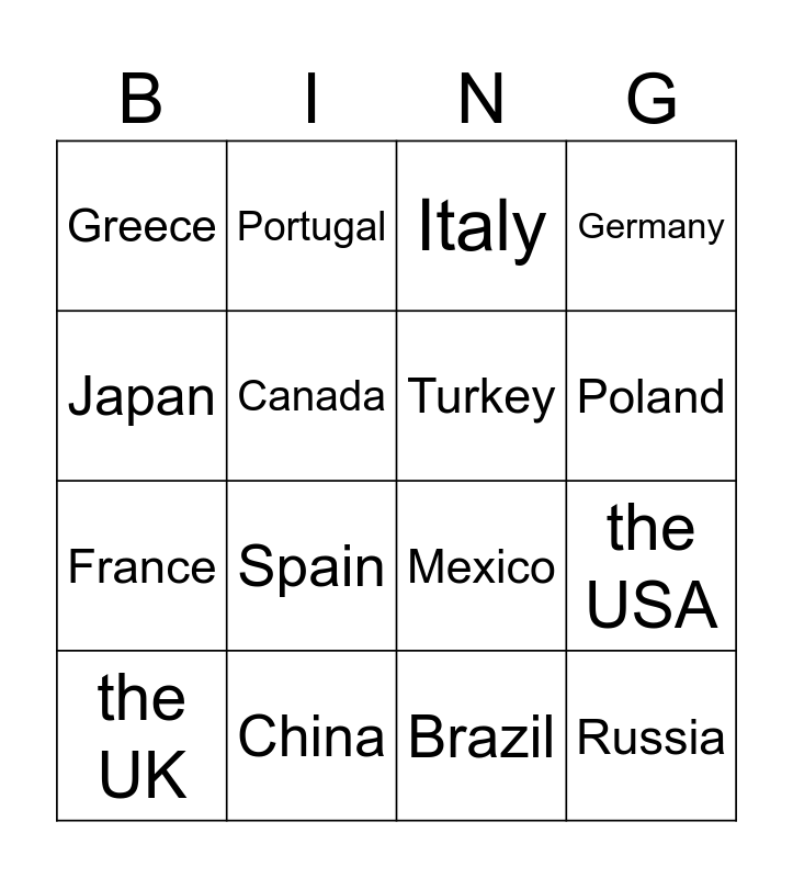 This bingo card has 16 words: China, the USA, Italy, Greece, France, Portugal, Mexico, Brazil, Japan, Canada, the UK, Germany, Spain, Poland, Turkey and Russia.