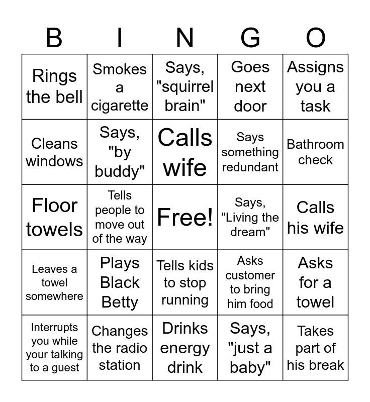 This bingo card has a free space and 24 words: Plays Black Betty, Changes the radio station, Calls wife, Interrupts you while your talking to a guest, Assigns you a task, Rings the bell, Cleans windows, Smokes a cigarette, Says, "Living the dream", Tells kids to stop running, Says something redundant, Floor towels, Asks customer to bring him food, Asks for a towel, Says, "by buddy", Says, "just a baby", Calls his wife, Says, "squirrel brain", Bathroom check, Tells people to move out of the way, Takes part of his break, Leaves a towel somewhere, Goes next door and Drinks energy drink.