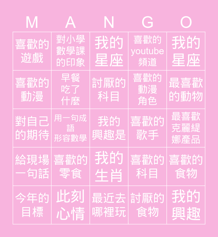 This bingo card has 50 words: 討厭的數學 單元, 我的 興趣是, 最近看的 一部電影, 最近去哪裡玩, 喜歡的零食, 喜歡的運動員, 對小學數學課 的印象, 奧運 關注 什麼比賽, 喜歡的動漫, 擅長的事情, 早餐 吃了 什麼, 喜歡的youtube頻道, 喜歡的食物, 喜歡的科目, 此刻的心情, 喜歡的一本書, 討厭的科目, 喜歡的歌手, 對國中數學課 的期望, 我的星座, 用一句成語 形容數學, 討厭的食物, 喜歡的遊戲, 喜歡的動漫 角色, 喜歡的數學 單元, 我的興趣, 最喜歡的動物, 家庭成員有幾位, 我的星座, 我的生肖, 喜歡的食物, 早餐吃了什麼, 喜歡電影, 喜歡的歌, 此刻心情, 喜歡的運動, 最近看的劇, 最近去哪裡玩, 想去哪個國家, 最喜歡克麗緹娜產品, 目前工作, 喜歡的歌手, 喜歡的演員, 喜歡的零食, 今年的目標, 對自己的期待, 我的個性, 最擅長的事, 給現場一句話 and 喜歡的飲料.