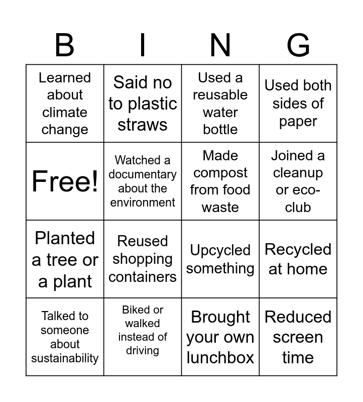 This bingo card has 16 words: Biked or walked instead of driving, Recycled at home, Used a reusable water bottle, Learned about climate change, Planted a tree or a plant, Said no to plastic straws, Upcycled something, Brought your own lunchbox, Free!, Watched a documentary about the environment, Talked to someone about sustainability, Used both sides of paper, Reused shopping containers, Joined a cleanup or eco-club, Made compost from food waste and Reduced screen time.