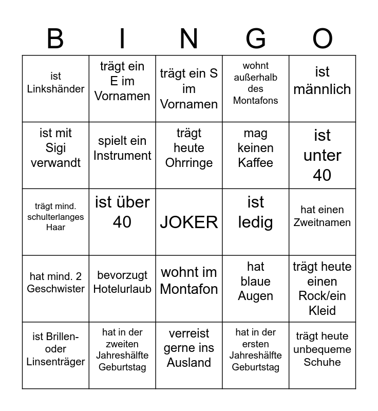 This bingo card has a free space and 35 words: hat eine Katze, ist tätowiert, ist weiblich, spielt ein Instrument, wohnt im Montafon, wohnt außerhalb des Montafons, ist mit Sigi verwandt, trägt ein A im Vornamen, trägt heute Ohrringe, ist mind. 10 Jahre verheiratet, trägt mind. schulterlanges Haar, ist männlich, besitzt ein Haustier, hat zwei oder mehr Kinder, ist Linkshänder, ist ledig, hat in der ersten Jahreshälfte Geburtstag, ist über 40, hat mind. 2 Geschwister, trägt heute unbequeme Schuhe, hat blaue Augen, ist Brillen- oder Linsenträger, trägt heute einen Rock/ein Kleid, hat in der zweiten Jahreshälfte Geburtstag, trägt ein S im Vornamen, ist unter 40, trägt heute einen Rock/ein Kleid, trägt mind. 1 Ring am Finger, mag keinen Kaffee, hat einen Zweitnamen, liebt Camping, verreist gerne ins Ausland, bevorzugt Hotelurlaub, trägt ein E im Vornamen and hat lackierte Fingernägel.