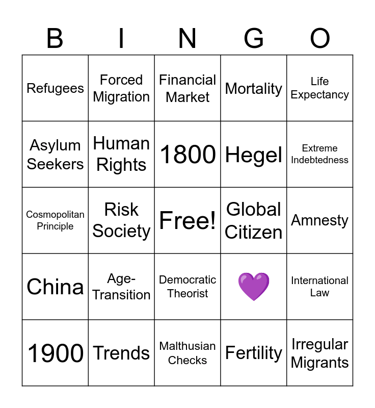 This bingo card has a free space and 25 words: Age-Transition, Malthusian Checks, 1800, 1900, Life Expectancy, Refugees, Asylum Seekers, Forced Migration, Global Citizen, Democratic Theorist, Hegel, Cosmopolitan Principle, 💜, International Law, Human Rights, Richard Falk, Amnesty, Financial Market, Extreme Indebtedness, Risk Society, Irregular Migrants, Trends, China, Mortality and Fertility.