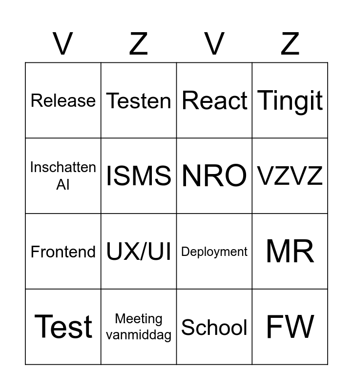 This bingo card has 39 words: Mailtje, Gemini, Pipeline, NRO, CBG, DVB, VZVZ, Supportal, Inschatten AI, FW, MR, Tingit, Test, School, Meeting vanmiddag, Gitlab, Presentatie, Release, Issue, Use Cases, ISMS, Backend, Frontend, UX/UI, Update, Fixen, Demo, Acceptatie, API, Testen, Spring, Service Desk, React, Video, Ekomenu, ElasticSearch, Uitrollen, Deployment and Leiden.