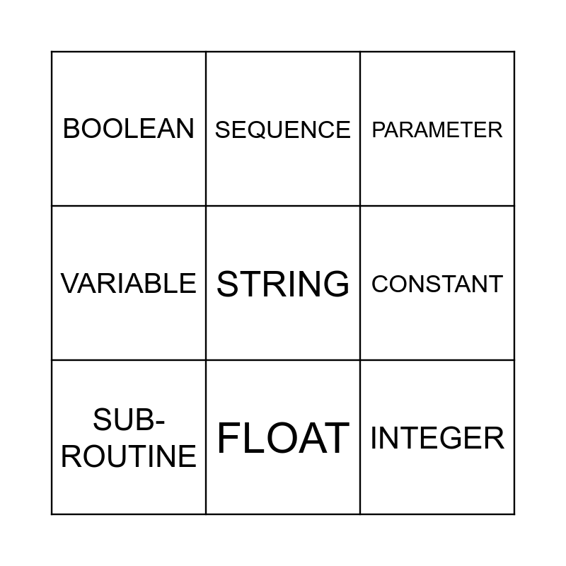 This bingo card has 14 words: SELECTION, ITERATION, SUB-ROUTINE, SEQUENCE, VARIABLE, STRING, INTEGER, LIST, FLOAT, BOOLEAN, CALCULATION, CONSTANT, PARAMETER and ARGUMENT.