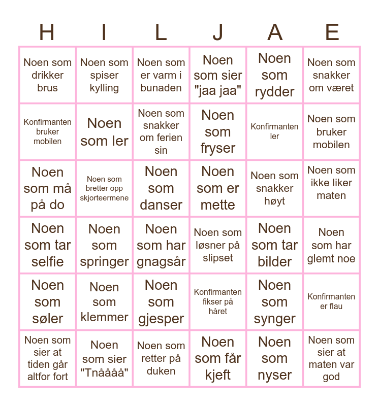 This bingo card has 36 words: Noen som tar selfie, Noen som springer, Noen som retter på duken, Noen som fryser, Noen som snakker høyt, Noen som ikke liker maten, Noen som drikker brus, Noen som sier "Tnåååå", Noen som er varm i bunaden, Konfirmanten fikser på håret, Konfirmanten ler, Noen som snakker om været, Noen som søler, Noen som bretter opp skjorteermene, Noen som snakker om ferien sin, Noen som sier "jaa jaa", Noen som synger, Noen som har glemt noe, Konfirmanten bruker mobilen, Noen som ler, Noen som har gnagsår, Noen som løsner på slipset, Noen som tar bilder, Konfirmanten er flau, Noen som må på do, Noen som spiser kylling, Noen som danser, Noen som får kjeft, Noen som rydder, Noen som bruker mobilen, Noen som sier at tiden går altfor fort, Noen som klemmer, Noen som gjesper, Noen som er mette, Noen som nyser and Noen som sier at maten var god.