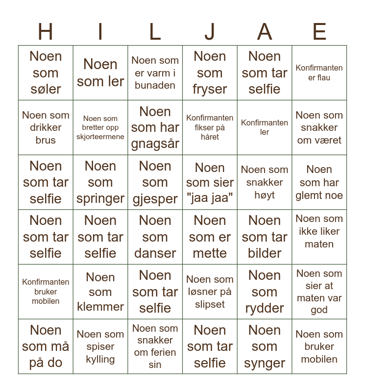 This bingo card has 42 words: Noen som tar selfie, Noen som springer, Noen som retter på duken, Noen som fryser, Noen som snakker høyt, Noen som ikke liker maten, Noen som drikker brus, Noen som sier "Tnåååå", Noen som er varm i bunaden, Konfirmanten fikser på håret, Konfirmanten ler, Noen som snakker om været, Noen som søler, Noen som bretter opp skjorteermene, Noen som snakker om ferien sin, Noen som sier "jaa jaa", Noen som synger, Noen som har glemt noe, Konfirmanten bruker mobilen, Noen som ler, Noen som har gnagsår, Noen som løsner på slipset, Noen som tar bilder, Konfirmanten er flau, Noen som må på do, Noen som spiser kylling, Noen som danser, Noen som får kjeft, Noen som rydder, Noen som bruker mobilen, Noen som sier at tiden går altfor fort, Noen som klemmer, Noen som gjesper, Noen som er mette, Noen som nyser, Noen som sier at maten var god, Noen som tar selfie, Noen som tar selfie, Noen som tar selfie, Noen som tar selfie, Noen som tar selfie and Noen som tar selfie.