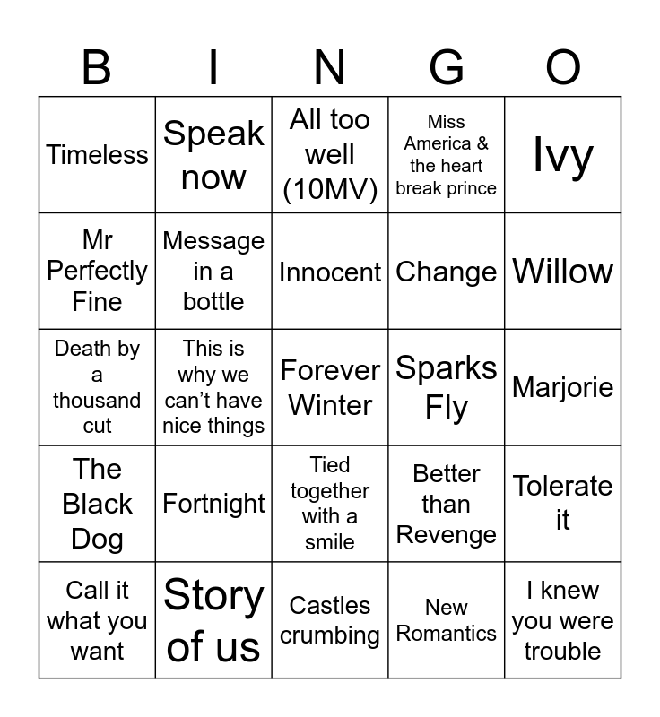 This bingo card has a free space and 24 words: Fortnight, Story of us, Innocent, Call it what you want, Ivy, Timeless, Mr Perfectly Fine, Speak now, Sparks Fly, Tied together with a smile, Change, Death by a thousand cut, Better than Revenge, Tolerate it, Message in a bottle, New Romantics, Marjorie, All too well (10MV), Willow, This is why we can’t have nice things, I knew you were trouble, The Black Dog, Miss America & the heart break prince and Castles crumbing.