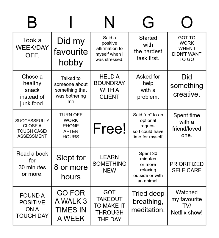 This bingo card has a free space and 24 words: Slept for 8 or more hours, GO FOR A WALK 3 TIMES IN A WEEK, HELD A BOUNDRAY WITH A CLIENT, FOUND A POSITIVE ON A TOUGH DAY, GOT TO WORK WHEN I DIDN'T WANT TO GO, Took a WEEK/DAY OFF., Chose a healthy snack instead of junk food., Did my favourite hobby, Said “no” to an optional request so I could have time for myself., LEARN SOMETHING NEW, Asked for help with a problem., SUCCESSFULLY CLOSE A TOUGH CASE/ ASSESSMENT, Spent 30 minutes or more relaxing outside or with an animal., PRIORITIZED SELF CARE, Talked to someone about something that was bothering me, Tried deep breathing, meditation., Spent time with a friend/loved one., Said a positive affirmation to myself when I was stressed., Did something creative., TURN OFF WORK PHONE AFTER HOURS, Watched my favourite TV/ Netflix show!, Read a book for 30 minutes or more., Started with the hardest task first. and GOT TAKEOUT TO MAKE IT THROUGH THE DAY.