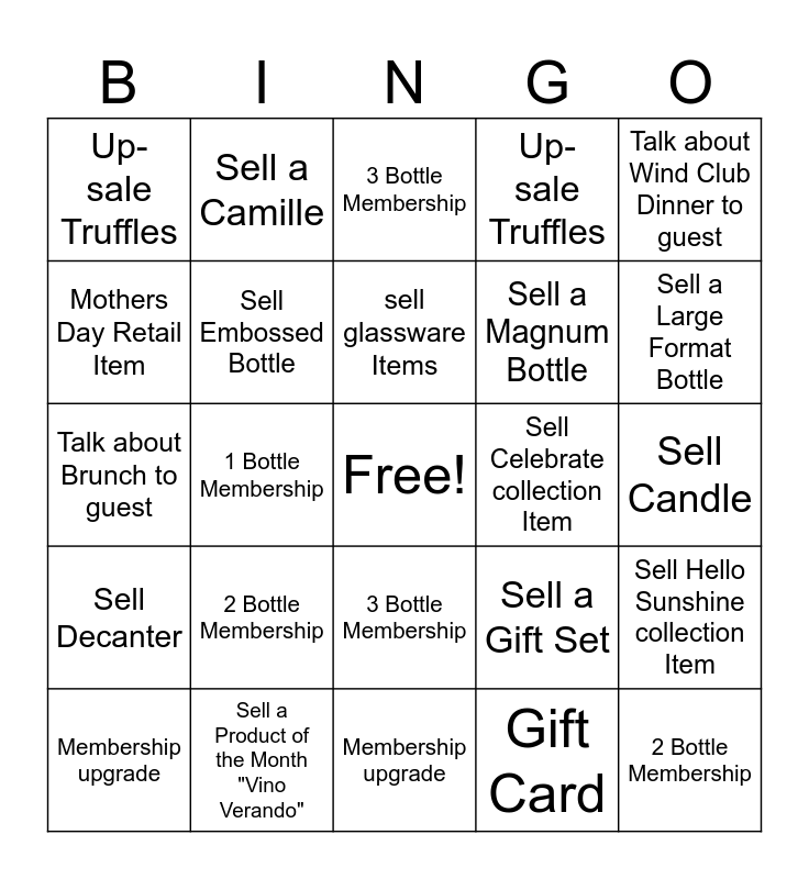 This bingo card has a free space and 24 words: 2 Bottle Membership, Sell a Product of the Month "Vino Verando", sell glassware Items, Membership upgrade, Talk about Wind Club Dinner to guest, Up-sale Truffles, Mothers Day Retail Item, Sell a Camille, Sell Celebrate collection Item, 3 Bottle Membership, Sell a Magnum Bottle, Talk about Brunch to guest, Sell a Gift Set, Sell Hello Sunshine collection Item, Sell Embossed Bottle, Gift Card, Sell Candle, 3 Bottle Membership, Sell a Large Format Bottle, 1 Bottle Membership, 2 Bottle Membership, Sell Decanter, Up-sale Truffles and Membership upgrade.