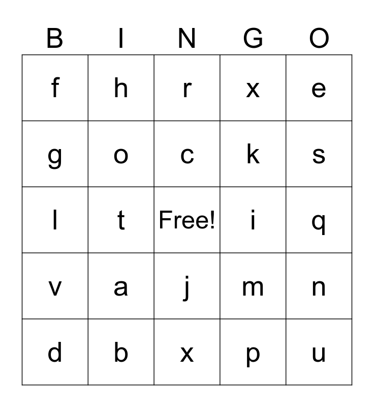 This bingo card has a free space and 24 words: a, b, c, d, e, f, g, h, i, j, k, l, m, n, o, p, q, r, s, t, u, v, x and x.