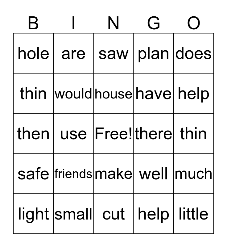 This bingo card has a free space and 24 words: friends, small, house, light, does, hole, thin, are, there, make, have, then, well, much, would, help, thin, saw, help, use, little, safe, plan and cut.