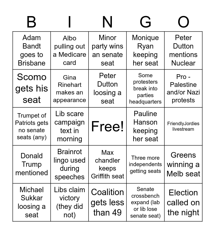 This bingo card has a free space and 24 words: Brainrot lingo used during speeches, Libs claim victory (they did not), Peter Dutton loosing a seat, Michael Sukkar loosing a seat, Peter Dutton mentions Nuclear, Adam Bandt goes to Brisbane, Scomo gets his seat, Albo pulling out a Medicare card, Pauline Hanson keeping her seat, Max chandler keeps Griffith seat, Some protesters break into parties headquarters, Trumpet of Patriots gets no senate seats (any), Three more independents getting seats, Greens winning a Melb seat, Gina Rinehart makes an appearance, Senate crossbench expand (lab or lib lose senate seat), FriendlyJordies livestream, Minor party wins an senate seat, Pro -Palestine and/or Nazi protests, Lib scare campaign text in morning, Election called on the night, Donald Trump mentioned, Monique Ryan keeping her seat and Coalition gets less than 49.