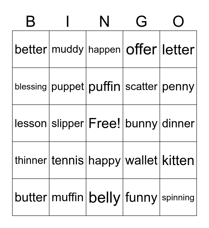 This bingo card has a free space and 24 words: tennis, muffin, puffin, butter, letter, better, blessing, muddy, bunny, happy, scatter, lesson, wallet, kitten, puppet, funny, dinner, happen, penny, slipper, spinning, thinner, offer and belly.