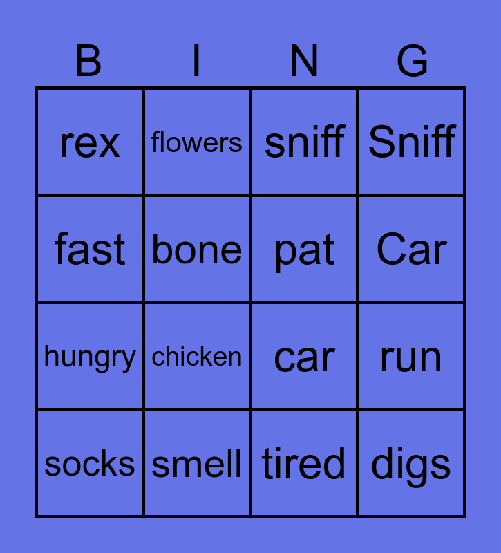 This bingo card has 19 words: car, hole, sniff, digs, run, fast, tired, rex, flowers, hungry, chicken, bone, pat, smell, socks, dog house, Sniff, Car and Hole.