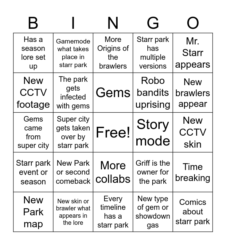 This bingo card has a free space and 24 words: New Park or second comeback, New skin or brawler what appears in the lore, Gems, New Park map, Mr. Starr appears, Has a season lore set up, New CCTV footage, Gamemode what takes place in starr park, Story mode, More collabs, Robo bandits uprising, Gems came from super city, Griff is the owner for the park, Time breaking, The park gets infected with gems, New type of gem or showdown gas, New CCTV skin, More Origins of the brawlers, New brawlers appear, Super city gets taken over by starr park, Comics about starr park, Starr park event or season, Starr park has multiple versions and Every timeline has a starr park.