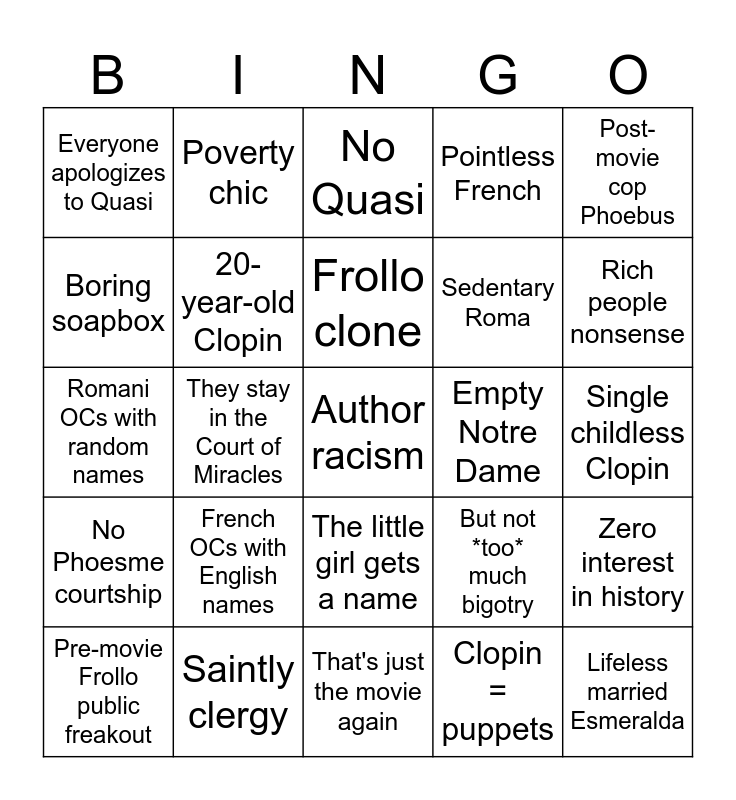 This bingo card has a free space and 24 words: French OCs with English names, Saintly clergy, Frollo clone, Pre-movie Frollo public freakout, Post-movie cop Phoebus, Everyone apologizes to Quasi, Boring soapbox, Poverty chic, Empty Notre Dame, The little girl gets a name, Sedentary Roma, Romani OCs with random names, But not *too* much bigotry, Zero interest in history, 20-year-old Clopin, Clopin = puppets, Single childless Clopin, No Quasi, Rich people nonsense, They stay in the Court of Miracles, Lifeless married Esmeralda, No Phoesme courtship, Pointless French and That's just the movie again.