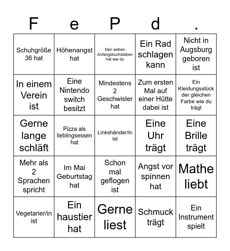 This bingo card has a free space and 24 words: Im Mai Geburtstag hat, Ein haustier hat, Mindestens 2 Geschwister hat, Vegetarier/in ist, Nicht in Augsburg geboren ist, Schuhgröße 36 hat, In einem Verein ist, Höhenangst hat, Eine Uhr trägt, Schon mal geflogen ist, Zum ersten Mal auf einer Hütte dabei ist, Gerne lange schläft, Angst vor spinnen hat, Mathe liebt, Eine Nintendo switch besitzt, Schmuck trägt, Eine Brille trägt, Den selben Anfangsbuchstaben hat wie du, Ein Kleidungsstück der gleichen Farbe wie du trägt, Pizza als lieblingsessen hat, Ein Instrument spielt, Mehr als 2 Sprachen spricht, Ein Rad schlagen kann and Gerne liest.