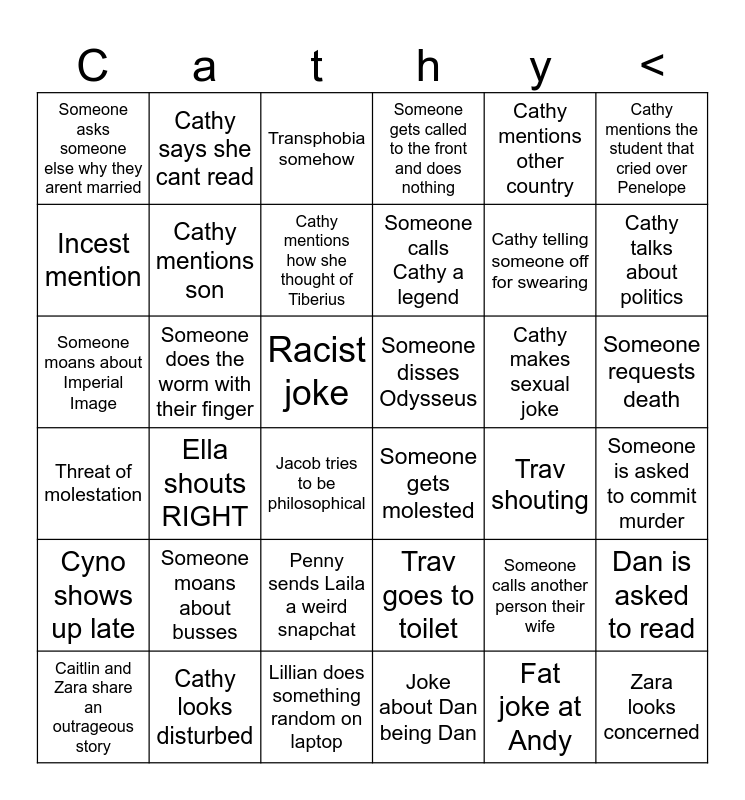 This bingo card has 36 words: Trav goes to toilet, Penny sends Laila a weird snapchat, Joke about Dan being Dan, Incest mention, Threat of molestation, Someone disses Odysseus, Cathy mentions son, Lillian does something random on laptop, Cathy mentions other country, Someone calls another person their wife, Cathy talks about politics, Someone gets called to the front and does nothing, Dan is asked to read, Someone does the worm with their finger, Someone calls Cathy a legend, Someone asks someone else why they arent married, Cyno shows up late, Cathy makes sexual joke, Someone moans about Imperial Image, Transphobia somehow, Racist joke, Ella shouts RIGHT, Someone gets molested, Jacob tries to be philosophical, Trav shouting, Cathy says she cant read, Cathy telling someone off for swearing, Cathy looks disturbed, Cathy mentions how she thought of Tiberius, Cathy mentions the student that cried over Penelope, Zara looks concerned, Caitlin and Zara share an outrageous story, Someone is asked to commit murder, Someone requests death, Someone moans about busses and Fat joke at Andy.