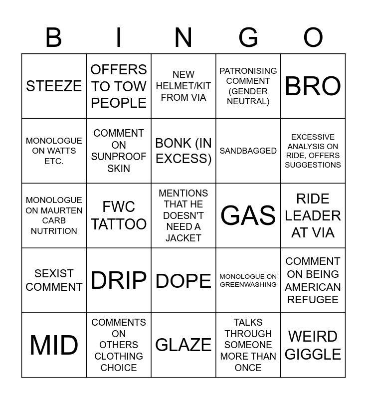 This bingo card has 25 words: DRIP, GLAZE, BONK (IN EXCESS), MID, BRO, STEEZE, MONOLOGUE ON WATTS ETC., OFFERS TO TOW PEOPLE, GAS, DOPE, SANDBAGGED, MONOLOGUE ON MAURTEN CARB NUTRITION, MONOLOGUE ON GREENWASHING, COMMENT ON BEING AMERICAN REFUGEE, COMMENT ON SUNPROOF SKIN, WEIRD GIGGLE, RIDE LEADER AT VIA, NEW HELMET/KIT FROM VIA, EXCESSIVE ANALYSIS ON RIDE, OFFERS SUGGESTIONS, FWC TATTOO, MENTIONS THAT HE DOESN'T NEED A JACKET, COMMENTS ON OTHERS CLOTHING CHOICE, SEXIST COMMENT, PATRONISING COMMENT (GENDER NEUTRAL) and TALKS THROUGH SOMEONE MORE THAN ONCE.
