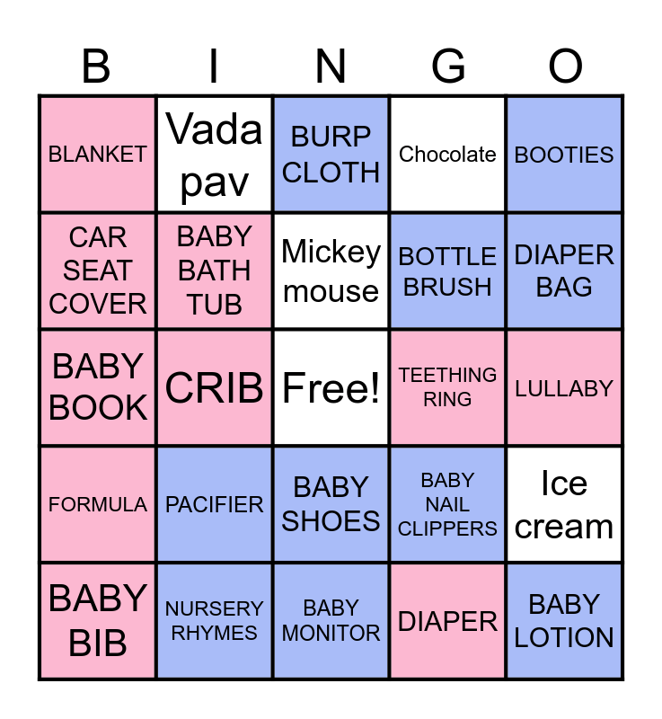 This bingo card has a free space and 29 words: BABY BIB, BOTTLE, CRIB, CAR SEAT, BLANKET, BURP CLOTH, BABY BATH TUB, PACIFIER, TEETHING RING, NURSERY RHYMES, LULLABY, BABY LOTION, BABY MONITOR, DIAPER, DIAPER BAG, STROLLER, BABY SHOES, FORMULA, BOOTIES, BABY BOOK, BABY NAIL CLIPPERS, ONSIE, BOTTLE BRUSH, CAR SEAT COVER, Chocolate, Vada pav, Ice cream, Mickey mouse and Starwberry.