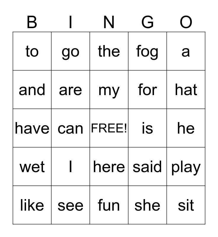 This bingo card has a free space and 24 words: I, see, my, like, a, to, and, go, is, here, for, have, said, play, are, she, he, the, hat, can, sit, wet, fog and fun.