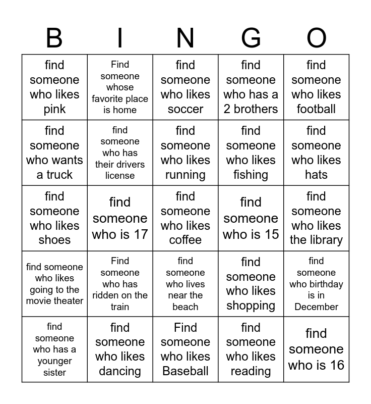 This bingo card has 35 words: Find someone who likes Basketball, Find someone who likes your favorite music, find someone who likes Movies, find someone who has their drivers license, find someone who lives near the beach, find someone who has a 2 brothers, find someone who wants a truck, find someone who likes traveling, find someone who likes running, find someone who likes playing games, find someone who likes shoes, find someone who likes football, Free!, find someone who lives in Beverly, find someone who likes pink, find someone who is 15, find someone who likes reading, find someone who is 17, find someone who likes going to the movie theater, find someone who likes coffee, find someone who likes shopping, find someone who has a younger sister, find someone who birthday is in December, find someone who likes dancing, find someone who likes soccer, find someone who likes hats, find someone who is 16, find someone who has been to a museum, find someone who likes fishing, find someone who likes the library, Find someone whose house is small, Find someone who likes Baseball, Find someone who has ridden on the train, Find someone whose favorite place is home and Find someone who likes to cook.