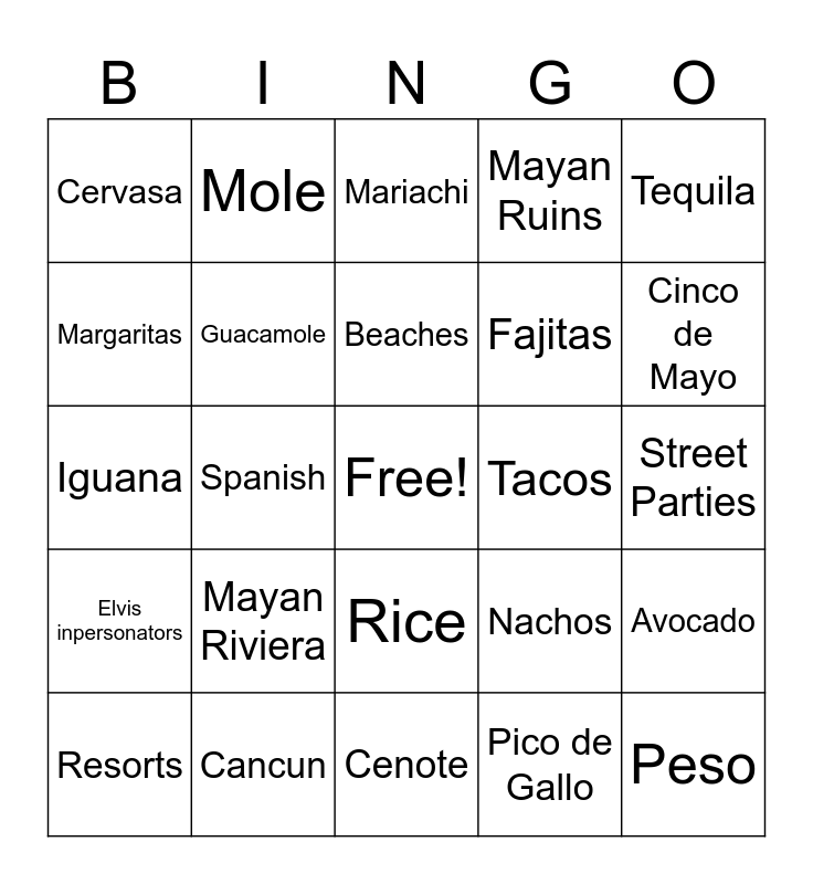 This bingo card has a free space and 24 words: Mayan Riviera, Cancun, Beaches, Resorts, Tequila, Cervasa, Margaritas, Mole, Tacos, Rice, Fajitas, Iguana, Nachos, Avocado, Guacamole, Pico de Gallo, Street Parties, Mariachi, Cinco de Mayo, Spanish, Peso, Elvis inpersonators, Mayan Ruins and Cenote.