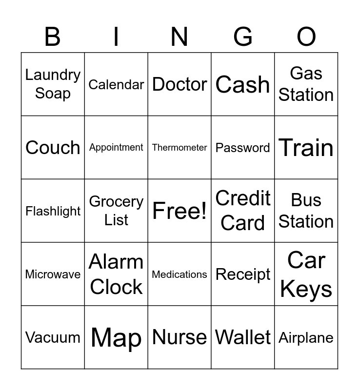 This bingo card has a free space and 24 words: Vacuum, Alarm Clock, Thermometer, Wallet, Gas Station, Laundry Soap, Calendar, Doctor, Credit Card, Bus Station, Flashlight, Appointment, Receipt, Car Keys, Couch, Map, Nurse, Cash, Train, Microwave, Grocery List, Medications, Password and Airplane.