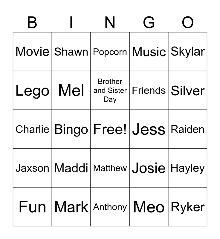 This bingo card has a free space and 29 words: Fun, Friday, Bingo, Play, Movie, Popcorn, Mel, Maddi, Jess, Mark, Raiden, Ryker, Anthony, Meo, Silver, Presley, Matthew, Jaxson, Skylar, Charlie, Josie, Games, Friends, Lego, Music, Shawn, Hayley, Brother and Sister Day and May 2.