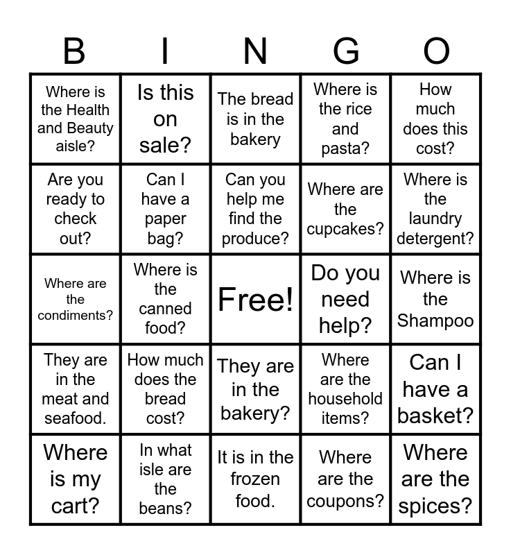 This bingo card has a free space and 24 words: How much does the bread cost?, In what isle are the beans?, Can you help me find the produce?, Where is my cart?, How much does this cost?, Where is the Health and Beauty aisle?, Are you ready to check out?, Is this on sale?, Do you need help?, They are in the bakery?, Where are the cupcakes?, Where are the condiments?, Where are the household items?, Can I have a basket?, Can I have a paper bag?, Where are the coupons?, Where is the Shampoo, The bread is in the bakery, Where is the laundry detergent?, Where is the canned food?, Where are the spices?, They are in the meat and seafood., Where is the rice and pasta? and It is in the frozen food..