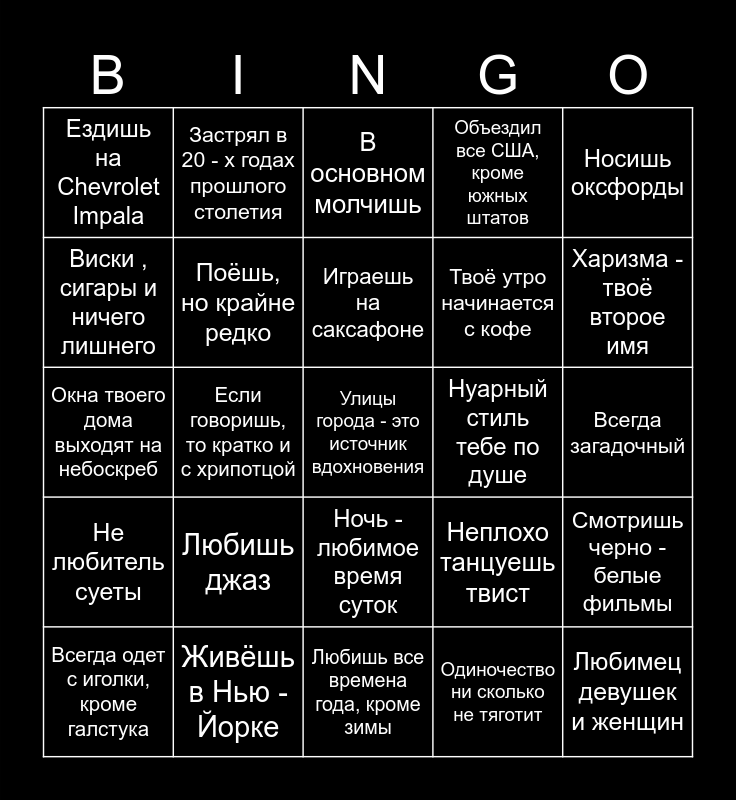 This bingo card has a free space and 24 words: Любишь джаз, Живёшь в Нью - Йорке, Играешь на саксафоне, Всегда одет с иголки, кроме галстука, Носишь оксфорды, Ездишь на Chevrolet Impala, Виски , сигары и ничего лишнего, Застрял в 20 - х годах прошлого столетия, Нуарный стиль тебе по душе, Ночь - любимое время суток, Твоё утро начинается с кофе, Окна твоего дома выходят на небоскреб, Неплохо танцуешь твист, Смотришь черно - белые фильмы, Поёшь, но крайне редко, Одиночество ни сколько не тяготит, Всегда загадочный, В основном молчишь, Харизма - твоё второе имя, Если говоришь, то кратко и с хрипотцой, Любимец девушек и женщин, Не любитель суеты, Объездил все США, кроме южных штатов and Любишь все времена года, кроме зимы.