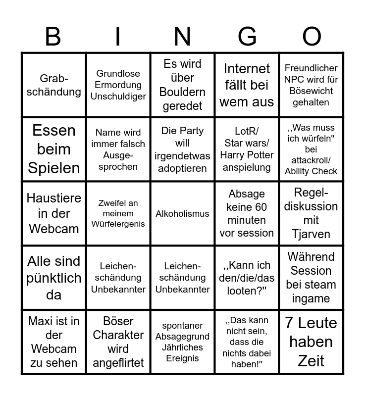 This bingo card has 25 words: Leichen-schändung Unbekannter, spontaner Absagegrund Jährliches Ereignis, Die Party will irgendetwas adoptieren, Maxi ist in der Webcam zu sehen, Freundlicher NPC wird für Bösewicht gehalten, Grab-schändung, Essen beim Spielen, Grundlose Ermordung Unschuldiger, Absage keine 60 minuten vor session, Leichen-schändung Unbekannter, LotR/ Star wars/ Harry Potter anspielung, Haustiere in der Webcam, ,,Kann ich den/die/das looten?'', Während Session bei steam ingame, Name wird immer falsch Ausge-sprochen, 7 Leute haben Zeit, Regel-diskussion mit Tjarven, Es wird über Bouldern geredet, ,,Was muss ich würfeln'' bei attackroll/ Ability Check, Zweifel an meinem Würfelergenis, Alkoholismus, Böser Charakter wird angeflirtet, Alle sind pünktlich da, Internet fällt bei wem aus and ,,Das kann nicht sein, dass die nichts dabei haben!''.