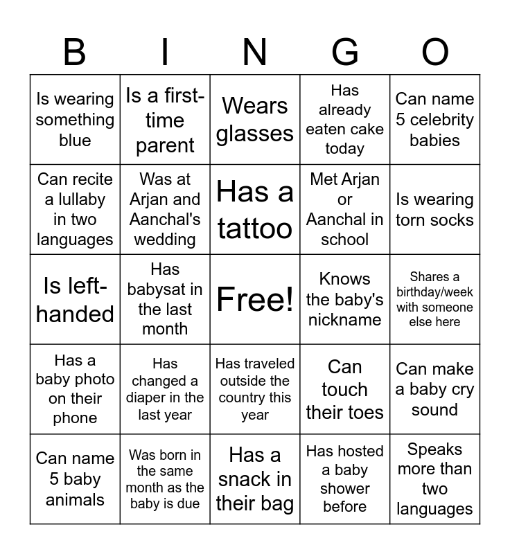 This bingo card has a free space and 24 words: Has changed a diaper in the last year, Was born in the same month as the baby is due, Has a tattoo, Can name 5 baby animals, Can name 5 celebrity babies, Is wearing something blue, Can recite a lullaby in two languages, Is a first-time parent, Knows the baby's nickname, Has traveled outside the country this year, Met Arjan or Aanchal in school, Is left-handed, Can touch their toes, Can make a baby cry sound, Was at Arjan and Aanchal's wedding, Has hosted a baby shower before, Shares a birthday/week with someone else here, Wears glasses, Is wearing torn socks, Has babysat in the last month, Speaks more than two languages, Has a baby photo on their phone, Has already eaten cake today and Has a snack in their bag.
