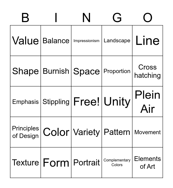 This bingo card has a free space and 24 words: Color, Form, Space, Texture, Line, Value, Shape, Balance, Unity, Variety, Proportion, Emphasis, Pattern, Movement, Burnish, Complementary Colors, Plein Air, Impressionism, Cross hatching, Stippling, Elements of Art, Principles of Design, Landscape and Portrait.