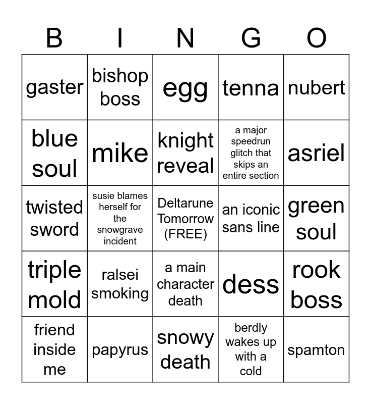 This bingo card has a free space and 24 words: friend inside me, ralsei smoking, knight reveal, berdly wakes up with a cold, nubert, gaster, bishop boss, egg, an iconic sans line, green soul, twisted sword, mike, dess, rook boss, blue soul, papyrus, snowy death, tenna, asriel, triple mold, susie blames herself for the snowgrave incident, a main character death, a major speedrun glitch that skips an entire section and spamton.
