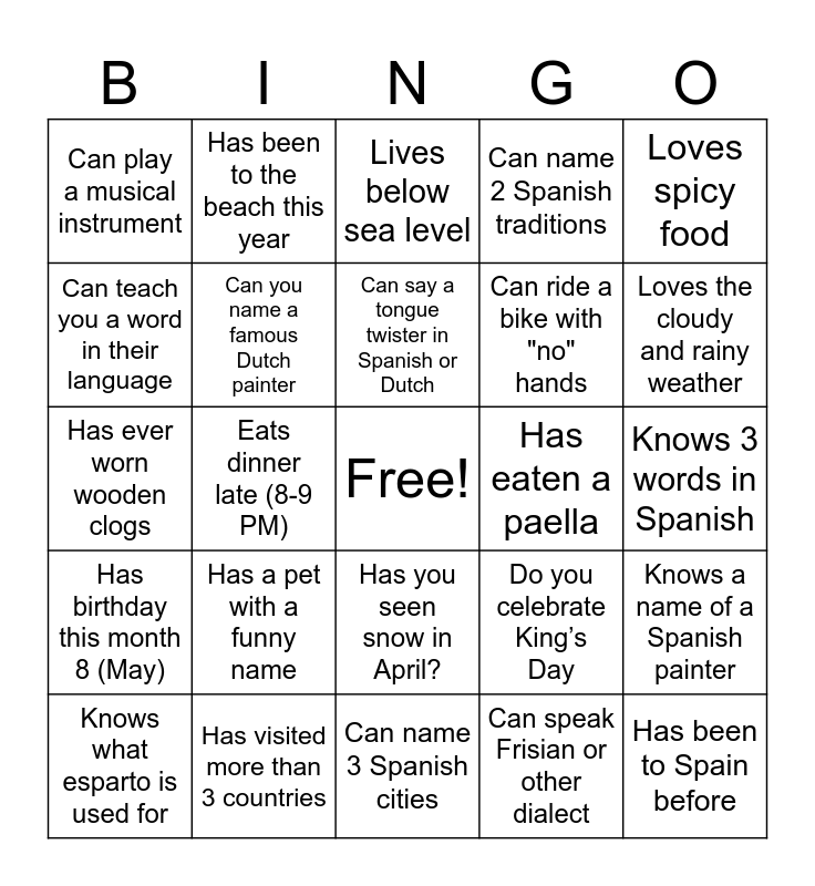 This bingo card has a free space and 24 words: Has a pet with a funny name, Has visited more than 3 countries, Can say a tongue twister in Spanish or Dutch, Knows what esparto is used for, Loves spicy food, Can play a musical instrument, Can teach you a word in their language, Has been to the beach this year, Has eaten a paella, Has you seen snow in April?, Can ride a bike with "no" hands, Has ever worn wooden clogs, Do you celebrate King’s Day, Knows a name of a Spanish painter, Can you name a famous Dutch painter, Can speak Frisian or other dialect, Knows 3 words in Spanish, Lives below sea level, Loves the cloudy and rainy weather, Eats dinner late (8-9 PM), Has been to Spain before, Has birthday this month 8 (May), Can name 2 Spanish traditions and Can name 3 Spanish cities.