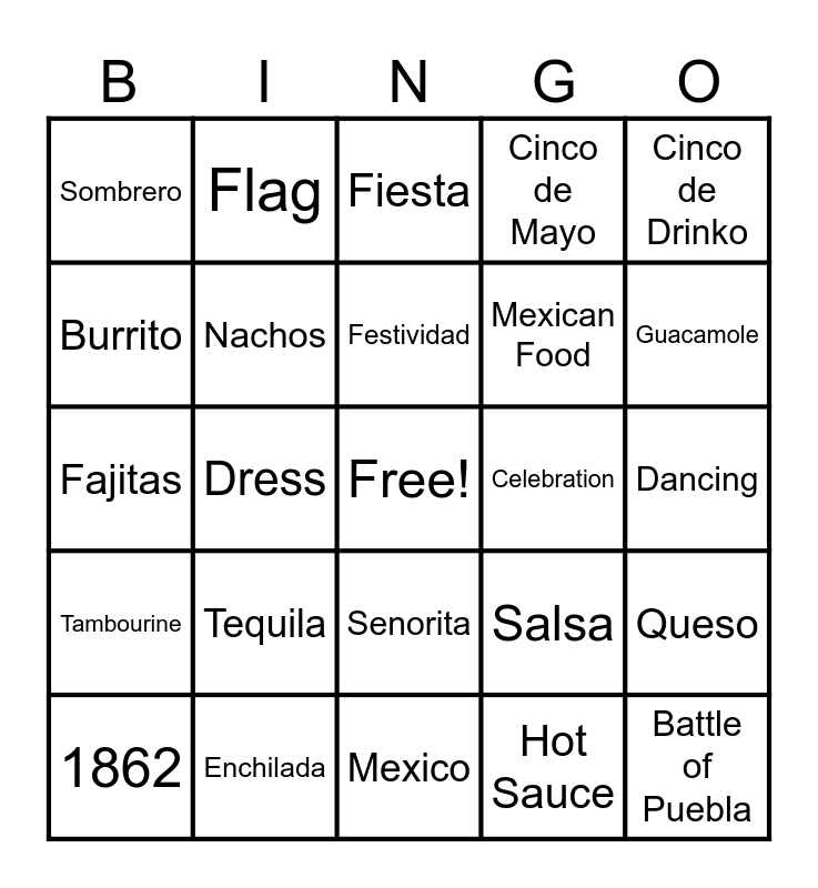 This bingo card has a free space and 25 words: Tequila, Mexico, Festividad, 1862, Cinco de Drinko, Sombrero, Burrito, Flag, Celebration, Senorita, Mexican Food, Fajitas, Salsa, Queso, Nachos, Tamales, Dancing, Fiesta, Guacamole, Dress, Battle of Puebla, Enchilada, Tambourine, Cinco de Mayo and Hot Sauce.