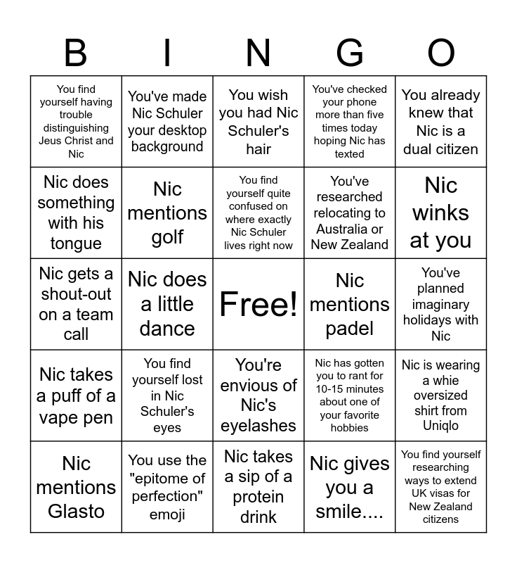 This bingo card has a free space and 24 words: You find yourself lost in Nic Schuler's eyes, You use the "epitome of perfection" emoji, You find yourself quite confused on where exactly Nic Schuler lives right now, Nic mentions Glasto, You already knew that Nic is a dual citizen, You find yourself having trouble distinguishing Jeus Christ and Nic, Nic does something with his tongue, You've made Nic Schuler your desktop background, Nic mentions padel, You're envious of Nic's eyelashes, You've researched relocating to Australia or New Zealand, Nic gets a shout-out on a team call, Nic has gotten you to rant for 10-15 minutes about one of your favorite hobbies, Nic is wearing a whie oversized shirt from Uniqlo, Nic mentions golf, Nic gives you a smile...., You've planned imaginary holidays with Nic, You wish you had Nic Schuler's hair, Nic winks at you, Nic does a little dance, You find yourself researching ways to extend UK visas for New Zealand citizens, Nic takes a puff of a vape pen, You've checked your phone more than five times today hoping Nic has texted and Nic takes a sip of a protein drink.