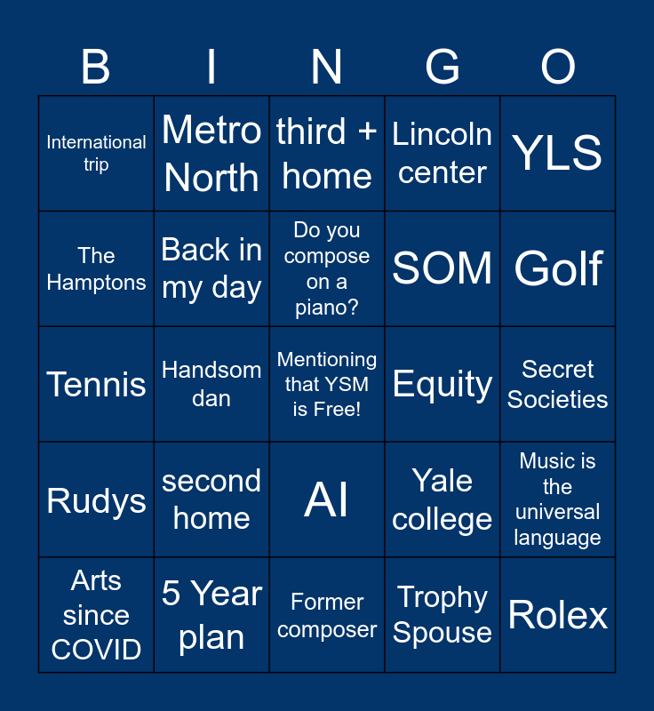 This bingo card has a free space and 24 words: second home, 5 Year plan, Do you compose on a piano?, Arts since COVID, YLS, International trip, The Hamptons, Metro North, Equity, AI, SOM, Tennis, Yale college, Music is the universal language, Back in my day, Trophy Spouse, Secret Societies, third + home, Golf, Handsom dan, Rolex, Rudys, Lincoln center and Former composer.