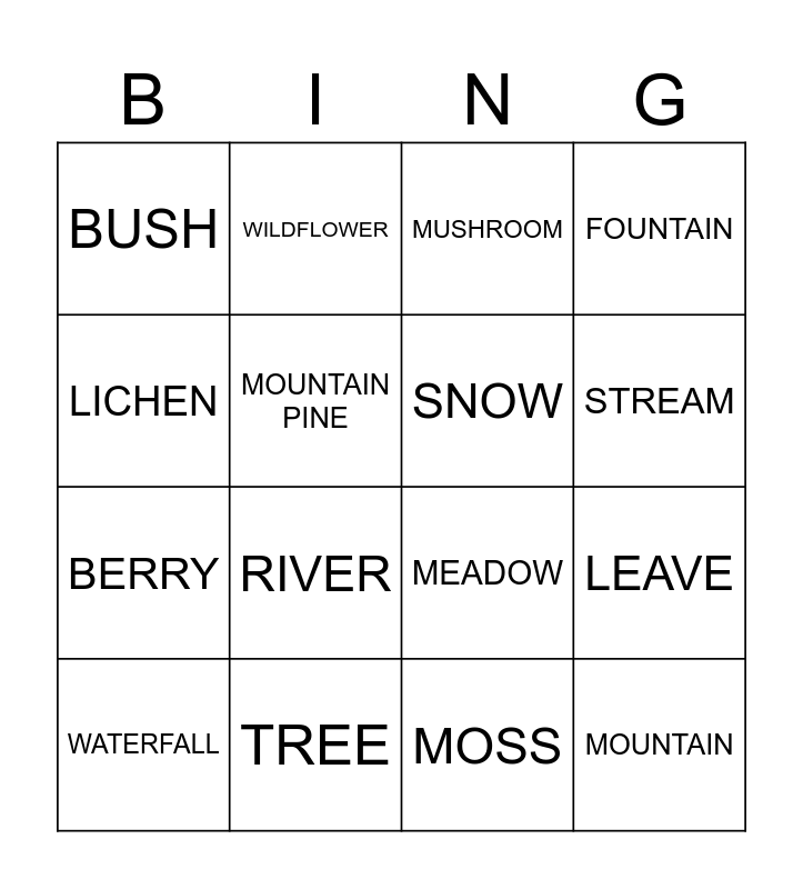 This bingo card has 16 words: TREE, LEAVE, MUSHROOM, BUSH, BERRY, WILDFLOWER, MEADOW, MOSS, LICHEN, MOUNTAIN PINE, WATERFALL, FOUNTAIN, RIVER, STREAM, SNOW and MOUNTAIN.