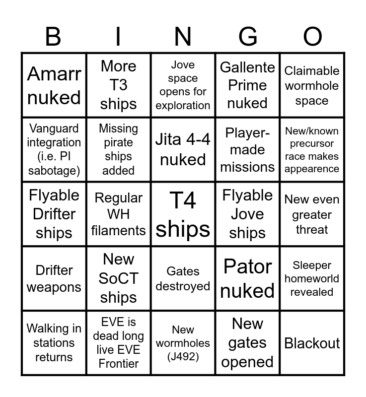 This bingo card has 25 words: New SoCT ships, New wormholes (J492), Jita 4-4 nuked, Walking in stations returns, Claimable wormhole space, Amarr nuked, Vanguard integration (i.e. PI sabotage), More T3 ships, Flyable Jove ships, Gates destroyed, Player-made missions, Flyable Drifter ships, Pator nuked, Sleeper homeworld revealed, Missing pirate ships added, Blackout, New even greater threat, Jove space opens for exploration, New/known precursor race makes appearence, Regular WH filaments, T4 ships, EVE is dead long live EVE Frontier, Drifter weapons, Gallente Prime nuked and New gates opened.