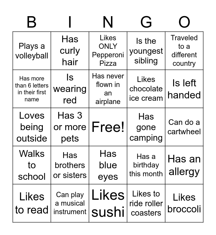 This bingo card has a free space and 24 words: Has brothers or sisters, Can play a musical instrument, Has never flown in an airplane, Likes to read, Traveled to a different country, Plays a volleyball, Has more than 6 letters in their first name, Has curly hair, Has gone camping, Has blue eyes, Likes chocolate ice cream, Loves being outside, Has a birthday this month, Has an allergy, Is wearing red, Likes to ride roller coasters, Can do a cartwheel, Likes ONLY Pepperoni Pizza, Is left handed, Has 3 or more pets, Likes broccoli, Walks to school, Is the youngest sibling and Likes sushi.