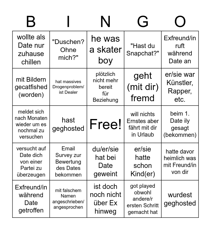 This bingo card has a free space and 24 words: Email Survey zur Bewertung des Dates bekommen, mit falschem Namen angeschrieben/ angesprochen, plötzlich nicht mehr bereit für Beziehung, Exfreund/in während Date getroffen, Exfreund/in ruft während Date an, wollte als Date nur zuhause chillen, mit Bildern gecatfished (worden), "Duschen? Ohne mich?", will nichts Ernstes aber fährt mit dir in Urlaub, du/er/sie hat bei Date geweint, geht (mit dir) fremd, meldet sich nach Monaten wieder um es nochmal zu versuchen, er/sie hatte schon Kind(er), hatte davor heimlich was mit Freund/in von dir, hat massives Drogenproblem/ ist Dealer, got played obwohl andere/r ersten Schritt gemacht hat, beim 1. Date ily gesagt (bekommen), he was a skater boy, er/sie war Künstler, Rapper, etc., hast geghosted, wurdest geghosted, versucht auf Date dich von einer Partei zu überzeugen, "Hast du Snapchat?" and ist doch noch nicht über Ex hinweg.
