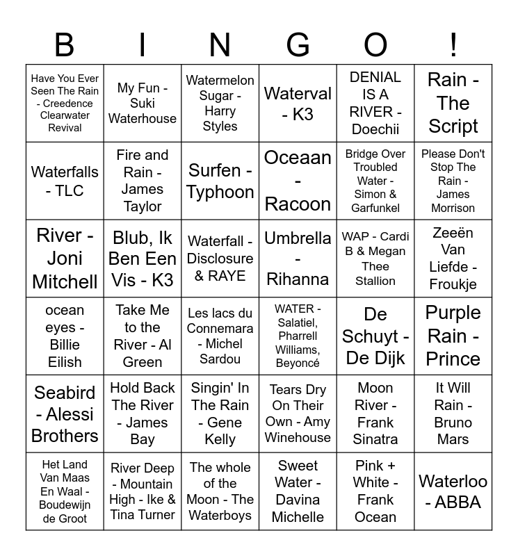 This bingo card has 76 words: 't dondert en 't bliksemt - Guus Meeuwis, Waterloo - ABBA, Watermelon Sugar - Harry Styles, Barbie girl - Aqua, Water Under the Bridge - Adele, Set Fire to the Rain - Adele, Sweet Water - Davina Michelle, Waves - Mr. Probz, The whole of the Moon - The Waterboys, Seaside Rendezvous - Queen, Seabird - Alessi Brothers, Seaside - the Kooks, Fire and Rain - James Taylor, Rain - The Script, Teardrops On My Guitar - Taylor Swift, Please Don't Stop The Rain - James Morrison, Tears Dry On Their Own - Amy Winehouse, River - Joni Mitchell, Liverpool Rain - Racoon, DENIAL IS A RIVER - Doechii, River Deep - Mountain High - Ike & Tina Turner, Bridge Over Troubled Water - Simon & Garfunkel, Waterfalls - TLC, My Fun - Suki Waterhouse, Waterval - K3, It's Raining Men - The Weather Girls, Cry Me a River - Justin Timberlak, I Follow Rivers - Lykke Li, Ice Ice Baby - Vanilla Ice, Dansen Aan Zee - BLØF, Het Land Van Maas En Waal - Boudewijn de Groot, Smoke On The Water - Deep Purple, De Kapitein Deel II - Acda en de Munnik, ocean eyes - Billie Eilish, Oceaan - Racoon, Surfen - Typhoon, Yellow Submarine - The Beatles, Surfin' U.S.A. - The Beach Boys, Waterfall - Disclosure & RAYE, Purple Rain - Prince, Walk on Water (H2O Mix) - Milk Inc., The River - Bruce Springsteen, Ik Ga Zwemmen - Mart Hoogkamer, Ik Wil Alleen Maar Zwemmen - Spinvis, Haus am See - Peter Fox, Hold Back The River - James Bay, Les lacs du Connemara - Michel Sardou, Have You Ever Seen The Rain - Creedence Clearwater Revival, Every Teardrop Is a Waterfall - Coldplay, Het Regent Zonnestralen - Acda en de Munnik, Singin' In The Rain - Gene Kelly, Zeeën Van Liefde - Froukje, Under the Sea - Disney, Pink + White - Frank Ocean, Oceanic Feeling - Lorde, (Sittin' On) the Dock of the Bay - Otis Redding, Moon River - Frank Sinatra, Smooth Sailin' - Leon Bridges, Sail - AWOLNATION, no tears left to cry - Ariana Grande, WAP - Cardi B & Megan Thee Stallion, Cake By The Ocean - DNCE, Wet Dream - Wet Leg, Oscar Winning Tears. - RAYE, Something in the Water - Brooke Fraser, Ship To Wreck - Florence + The Machine, Blub, Ik Ben Een Vis - K3, It Will Rain - Bruno Mars, Water - Tyla, Rivers of Babylon - Boney M., Take Me to the River - Al Green, Umbrella - Rihanna, WATER - Salatiel, Pharrell Williams, Beyoncé, Aan De Kust - BLØF, De Schuyt - De Dijk and Orinoco Flow - Enya.