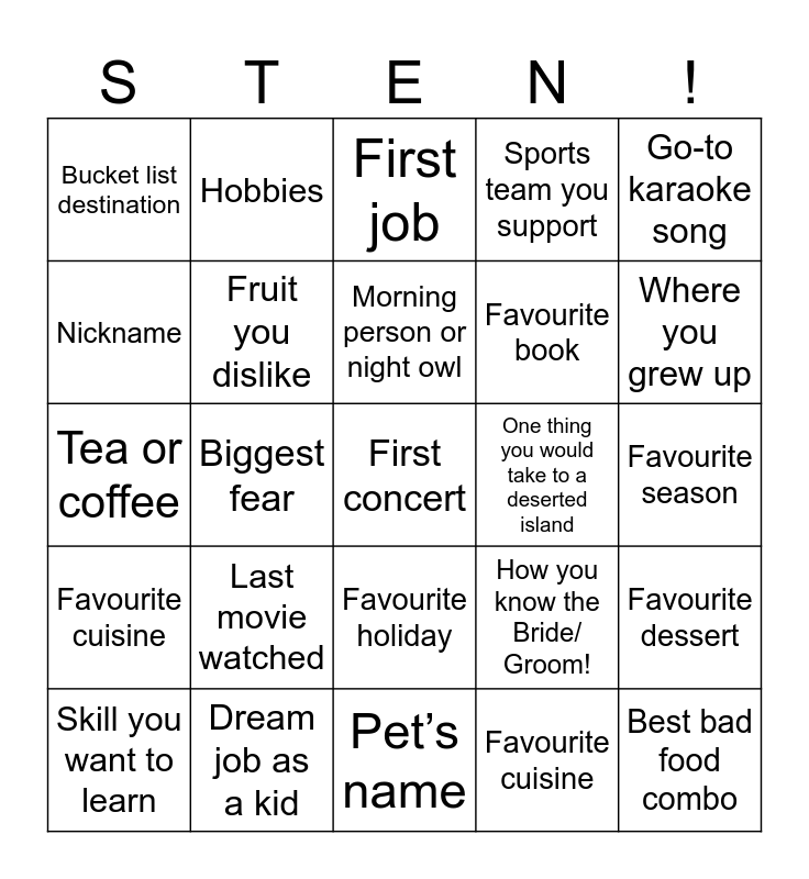 This bingo card has 25 words: Last movie watched, Pet’s name, Morning person or night owl, Skill you want to learn, Go-to karaoke song, Bucket list destination, Nickname, Hobbies, One thing you would take to a deserted island, Favourite holiday, Favourite book, Tea or coffee, How you know the Bride/ Groom!, Favourite dessert, Fruit you dislike, Best bad food combo, Favourite season, First job, Where you grew up, Biggest fear, First concert, Dream job as a kid, Favourite cuisine, Sports team you support and Favourite cuisine.
